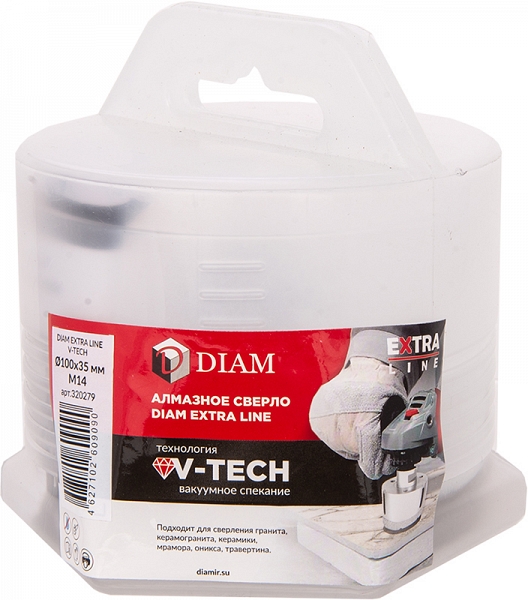 Алмазное сверло вакуумного спекания Diam Extra Line V-Tech M14 100 мм (Диам Экстра Лайн В-Теч М14 100 мм) предназначено для сверления отверстий Ø 100 мм, глубиной до 35 мм в керамике, граните, керамограните, мраморе, ониксе, травертине без водяного охлаждения при помощи ушм (болгарок), перфораторов, дрелей.