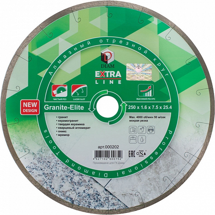 Алмазный отрезной круг Diam Extra Line 1A1R Корона Granite-Elite 250 мм (Диам Экстра Лайн 1А1Р Корона Гранит-Элит 250 мм) – премиальный алмазный диск для мокрой резки гранита, керамогранита, твердой керамики, кварцевого агломерата, оникса, мрамора, габбро, лабрадорита, базальта и других пород твердого натурального камня на бензорезах, электрических резчиках и плиткорезах, камнерезных станках, стенорезных машинах с подачей воды. За долгое время зарекомендовал себя с отличной стороны у многих мастеров, как инструмент, обеспечивающий очень качественное выполнение задач практически по всем твердым материалам, при этом имеет очень большой ресурс и скорость работы.