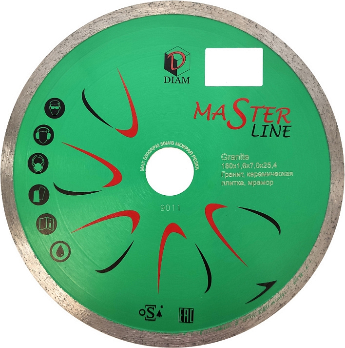 Алмазный отрезной круг Diam Master Line 1A1R Корона Granite 180 мм (Диам Мастер Лайн 1А1Р Корона Гранит 180 мм) – универсальный недорогой алмазный диск высокого качества со сплошной режущей кромкой для резки гранитной, мраморной и керамической плитки болгарками (ушм), штроборезами и плиткорезами электрическими с подачей воды.