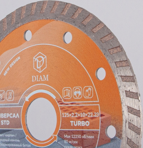 Алмазный отрезной круг Diam STD Turbo Универсал 125 мм (Диам СТД Турбо Универсал 125 мм) – универсальный алмазный отрезной диск тип turbo для сухой резки гранита, кирпича, природного камня, слабоармированного бетона (железобетона) на ручных углошлифовальных машинах (ушм, болгарках), штроборезах, системах резки крупноформатной плитки без водяного охлаждения.