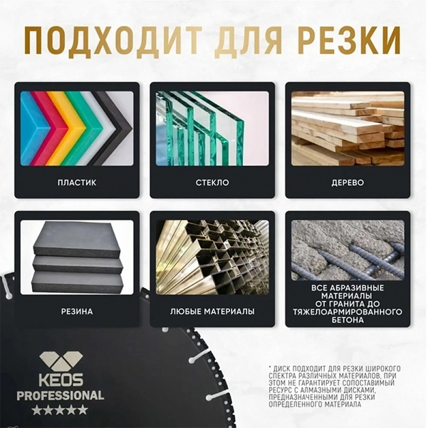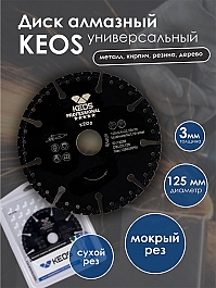 Диск алмазный универсальный Keos Professional 125 мм (Кеос Профессионал 125 мм) предназначен для резки металлов, пластика, резины, бетона, армированного бетона (железобетона), кирпича, древесины и т.д. ушм (болгарками), штроборезами, системами резки крупноформатной плитки, как с подачей воды, так и всухую. Подходит для универсального использования, аварийно-спасательных работ и многого другого.