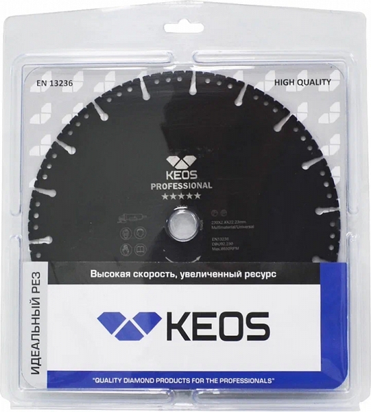 Диск алмазный универсальный Keos Professional 230 мм (Кеос Профессионал 230 мм) предназначен для резки металлов, пластика, резины, бетона, армированного бетона (железобетона), кирпича, древесины и т.д. ушм (болгарками), штроборезами, бензорезами, электрическими резчиками и плиткорезами, стенорезными машинами, как с подачей воды, так и всухую. Подходит для универсального использования, аварийно-спасательных работ и многого другого.