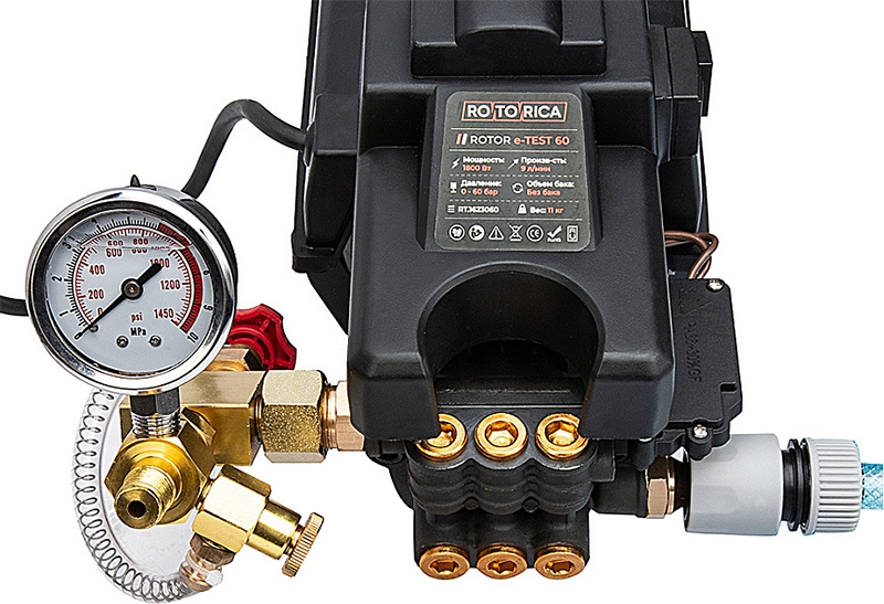 Электрический опрессовщик Rotorica Rotor E-Test 60 (Роторика Ротор Е-Тест 60) – насос электрический гидравлический испытательный с манометром без бака (резервуара) для точных и быстрых гидравлических испытаний под давлением до 60 бар на прочность и герметичность различных гидравлических систем, всех видов сосудов высокого давления, труб внутренних инженерных систем, противопожарных труб и всех видов приборов отопления, а также для технического обслуживания.