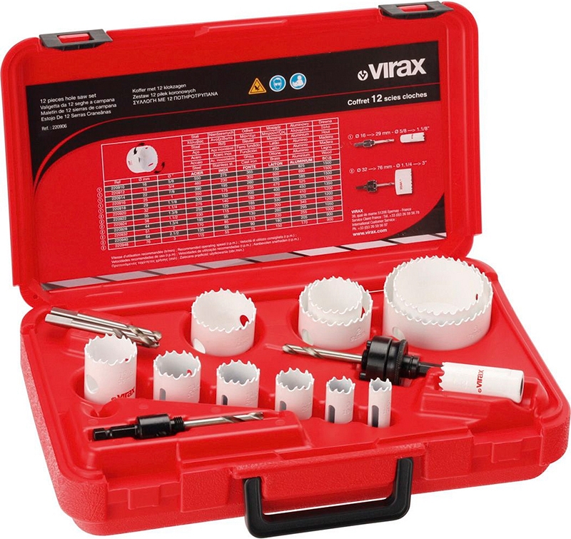 Набор биметаллических коронок Virax Bi-Metal HSS 16-19-22-25-29-32-35-38-44-51-64-76 мм (Виракс Би-Металл ХСС 16-19-22-25-29-32-35-38-44-51-64-76 мм) предназначен для выпиливания, вырезания и сверления отверстий Ø 16, 19, 22, 25, 29, 32, 35, 38, 44, 51, 64, 76 мм в трубах, металлических листах, бетоне, кирпиче, дереве, пластике. Используются со сверлильными станками для вырезания отверстий в трубах, а также с обычными дрелями.