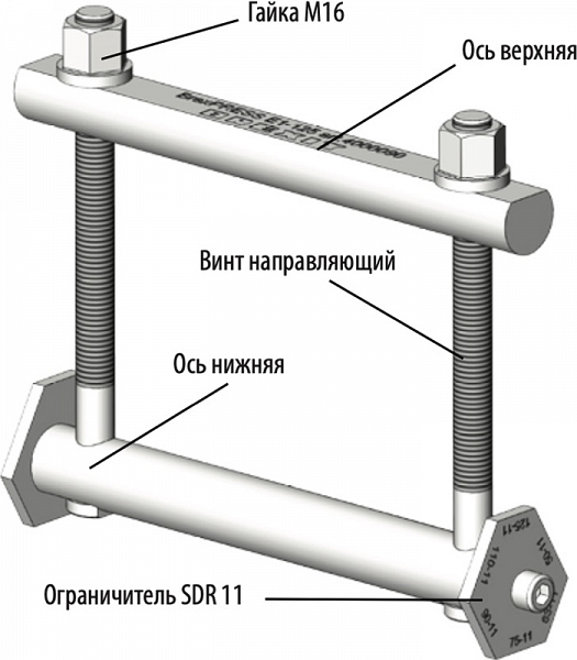 - Установите нижнюю ось с направляющими винтами под трубу в месте передавливания (при необходимости винты можно достать)