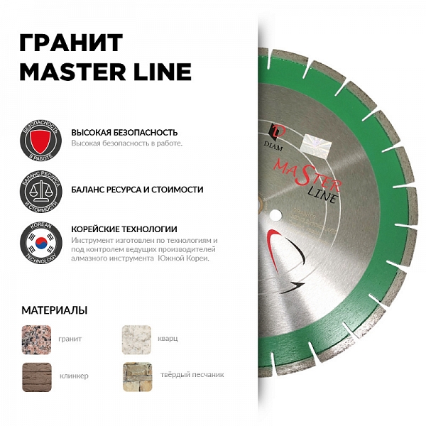 Сегментный алмазный круг Diam Master Line 1A1RSS Гранит 300 мм (Диам Мастер Лайн 1А1РСС Гранит 300 мм) – специальный сегментный алмазный отрезной диск для сухой и мокрой резки гранита, кварца, клинкера, твердых песчаников на бензорезах, электрических резчиках и плиткорезах, системах резки крупноформатной плитки, камнерезных станках, стенорезных машинах, швонарезчиках и другом оборудовании, как с подачей, так и без подачи охлаждающей жидкости.