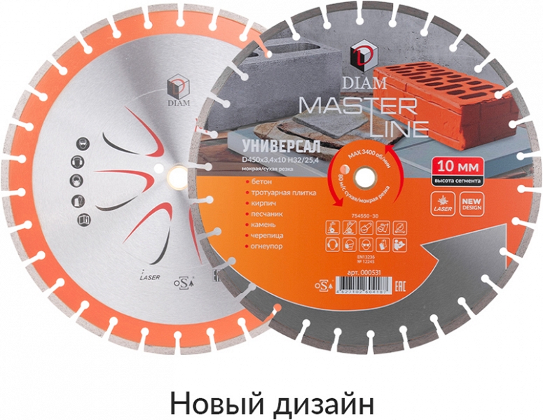 Сегментный алмазный круг Diam Master Line 1A1RSS Универсал 450 мм (Диам Мастер Лайн 1А1РСС Универсал 450 мм) – специальный алмазный отрезной диск с лазерной сваркой сегментов для сухой и мокрой резки бетона, тротуарной плитки, кирпича, черепицы, песчаника, природного и искусственного камня, строительных материалов общего назначения на камнерезных станках, стенорезных машинах, швонарезчиках, с подачей и без подачи воды.