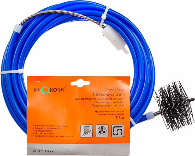 Трос для прочистки дымохода, вентиляции, труб Крокочист 8 мм × 7,6 м (Crocochist 8 mm × 7,6 m) – прочистное устройство 3 в 1 для очистки дымоходов от сажи, вентиляционных каналов от пыли и проведения профилактики в канализационных трубах (проходит повороты) Ø 50 – 100 мм.