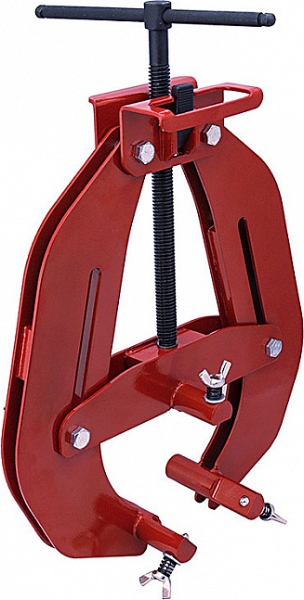- Окрашенная, разборная, струбцинная, прочная стальная конструкция повышенной прочности из кованной стали состоит из стальной рамы с 2-мя ножками с направляющими прорезями и верхнего прижима с затяжным винтом, которые регулируют охват основных труб, и вкручиваемых в них лепестковых винтов из нержавеющей стали с пружинами для центрирования подсоединяемых труб и элементов: легкий монтаж, надежность и безопасности использования