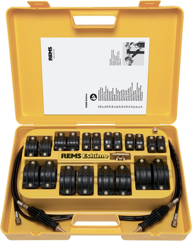 - REMS Эскимо Сет. Устройство для заморозки труб диоксидом углерода. Для труб из стали, меди, пластмассы, металлопластика Ø 1/8" – 2", 10 – 60 мм. По 2 шт. манжеты для замораживания 10 разных величин для всего рабочего диапазона, фланцевое соединение с тройником, глухая гайка, 2 рукоятки с инжектором, 2 шланга высокого давления. В прочном чемодане.
